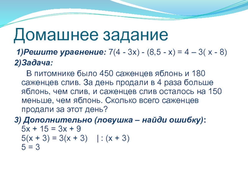 3) Дополнительно (ловушка – найди ошибку): 5x + 15 = 3x + 9  5(x + 3) = 3(x + 3) | : (x + 3)  5 = 3