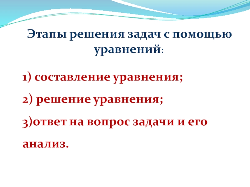 Этапы решения задач с помощью уравнений:1) составление уравнения;2) решение уравнения;3)ответ на вопрос задачи и его