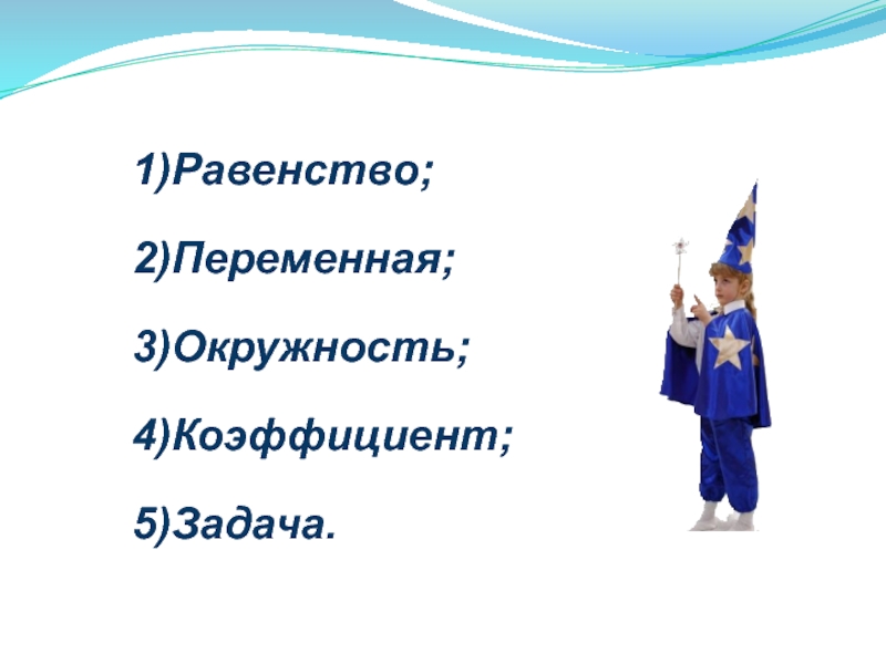 1)Равенство;		2)Переменная;		3)Окружность;		4)Коэффициент;		5)Задача.