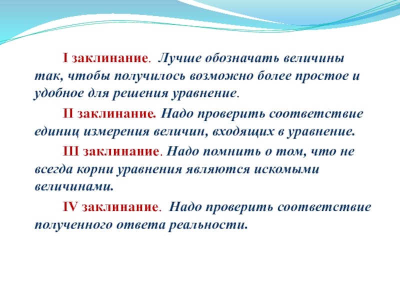Слайд 19 I заклинание. Лучше обозначать величины так, чтобы получилось возможно более простое