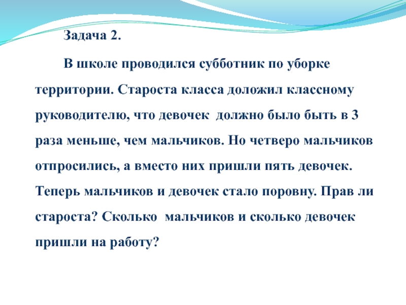 Задача 2.		В школе проводился субботник по уборке территории. Староста класса доложил классному руководителю, что девочек должно было