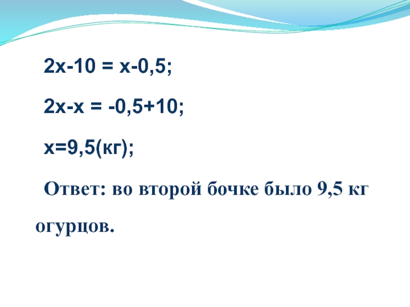 2х-10 = х-0,5;	2х-х = -0,5+10;	х=9,5(кг);	Ответ: во второй бочке было 9,5 кг огурцов.