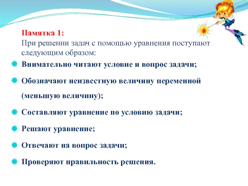 Памятка 1: При решении задач с помощью уравнения поступают следующим образом:Внимательно читают условие и вопрос задачи;Обозначают