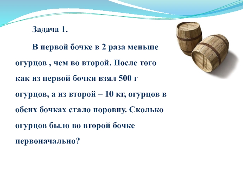 Задача 1. 		В первой бочке в 2 раза меньше огурцов , чем во второй. После того как