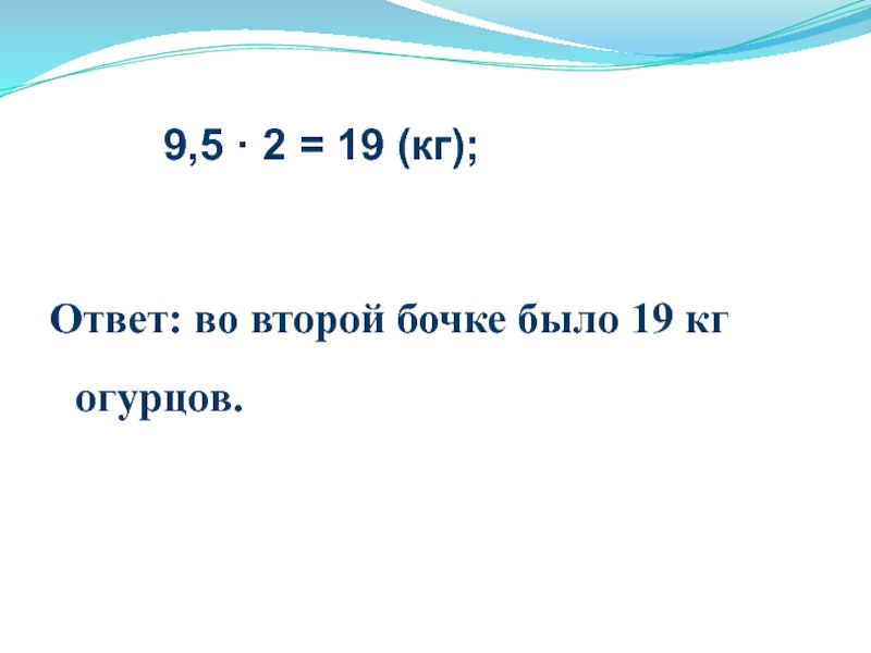 9,5  2 = 19 (кг);	Ответ: во второй бочке было 19 кг
