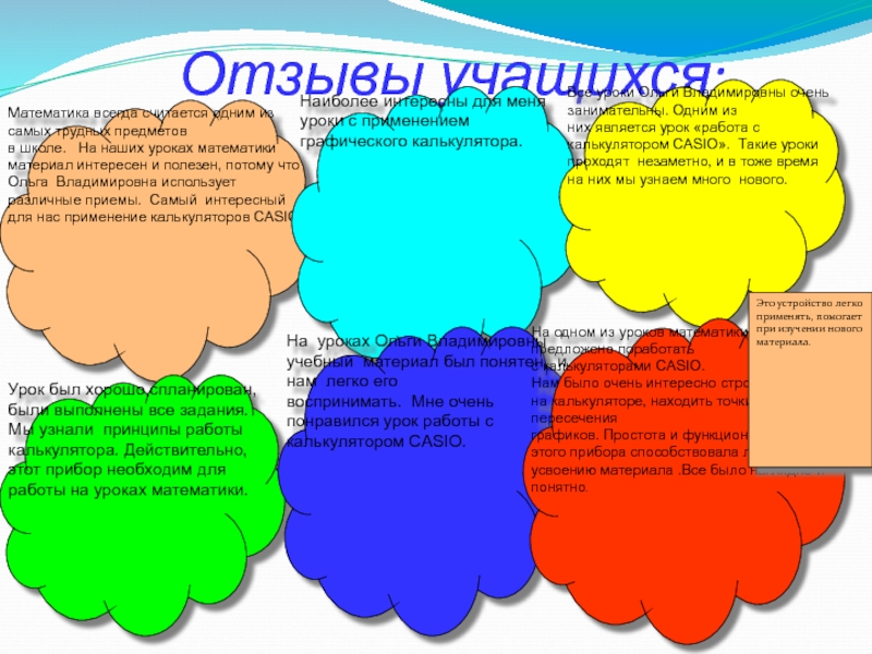 Урок был хорошо спланирован, были выполнены все задания. Мы узнали принципы работы калькулятора. Действительно, этот прибор необходим для работы на уроках математики.