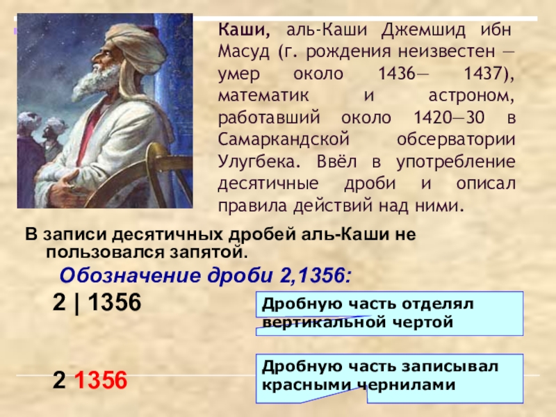 В записи десятичных дробей аль-Каши не пользовался запятой.
