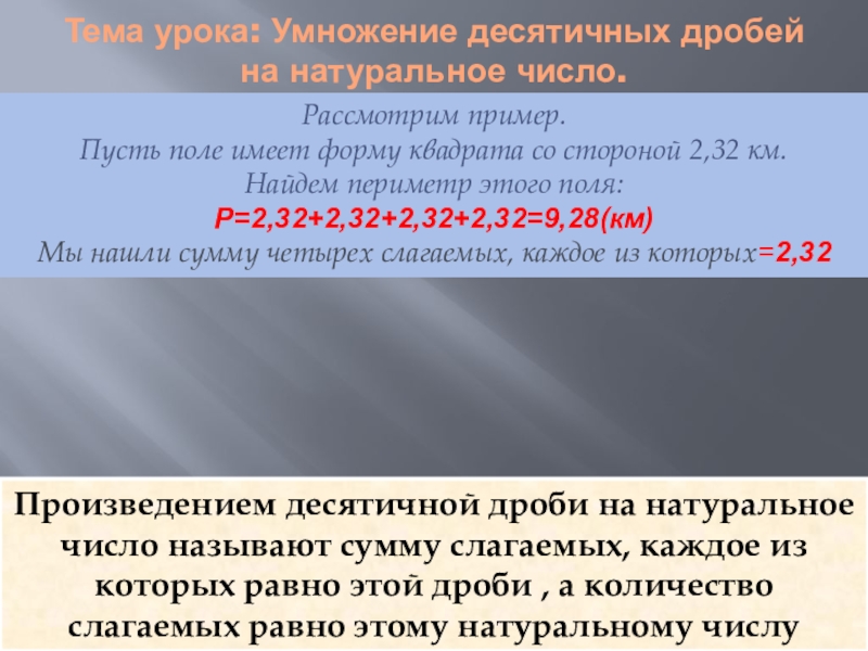 Произведением десятичной дроби на натуральное число называют сумму слагаемых, каждое из которых равно этой дроби , а количество слагаемых равно этому натуральному числу