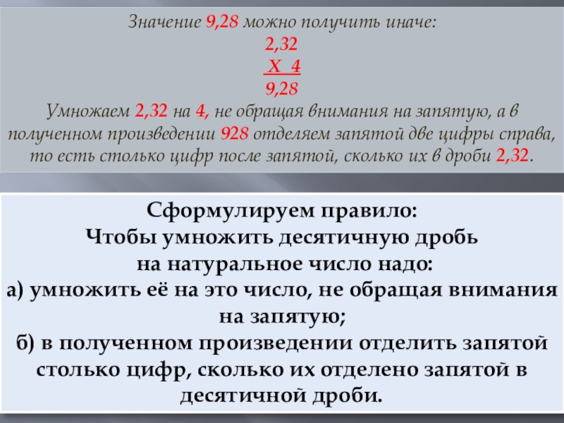 б) в полученном произведении отделить запятой столько цифр, сколько их отделено запятой в десятичной дроби.