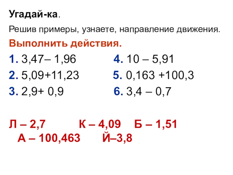 Угадай-ка.    Решив примеры, узнаете, направление движения. Выполнить действия. 1. 3,47– 1,96