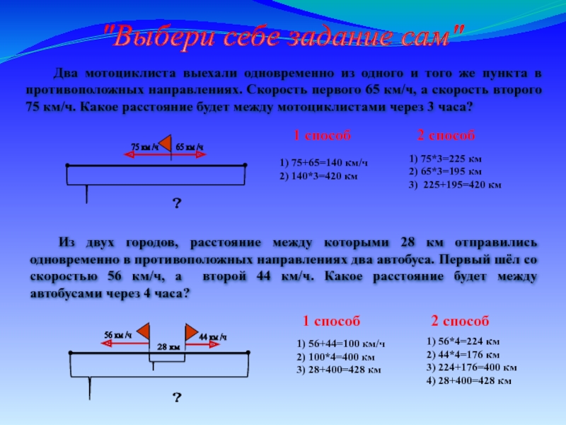 Из двух городов, расстояние между которыми 28 км отправились одновременно в противоположных направлениях два автобуса. Первый шёл со скоростью 56 км/ч, а второй 44 км/ч. Какое расстояние будет между автобусами через 4 часа?