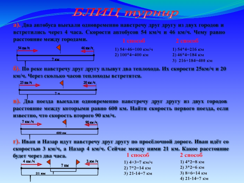 б). По реке навстречу друг другу плывут два теплохода. Их скорости 25км/ч и 20 км/ч. Через сколько часов теплоходы встретятся.