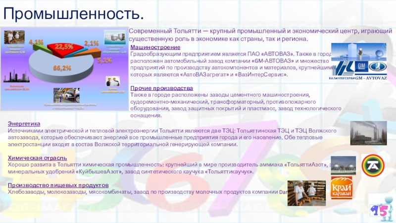 Хорошо развита в Тольятти химическая промышленность: крупнейший в мире производитель аммиака «ТольяттиАзот», завод минеральных удобрений «КуйбышевАзот», завод синтетического каучука «Тольяттикаучук».