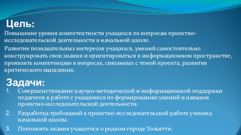 Совершенствование научно-методической и информационной поддержки педагогов в работе с учащимися по формированию умений и навыков проектно-исследовательской деятельности.