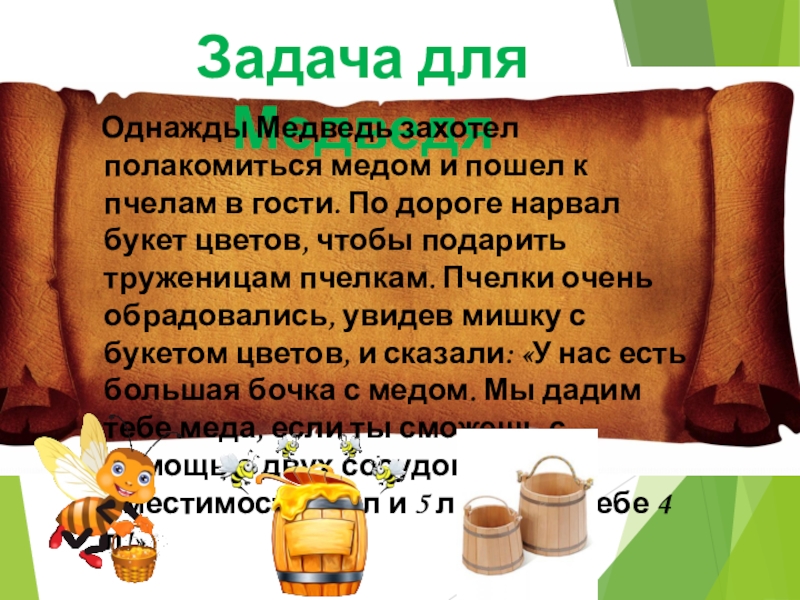 к пчелам в гости. По дороге нарвал букет цветов, чтобы подарить труженицам пчелкам. Пчелки очень обрадовались, увидев мишку с букетом цветов, и сказали: «У нас есть большая бочка с медом. Мы дадим тебе меда, если ты сможешь с помощью двух сосудов вместимостью 3 л и 5 л налить себе 4 л!»