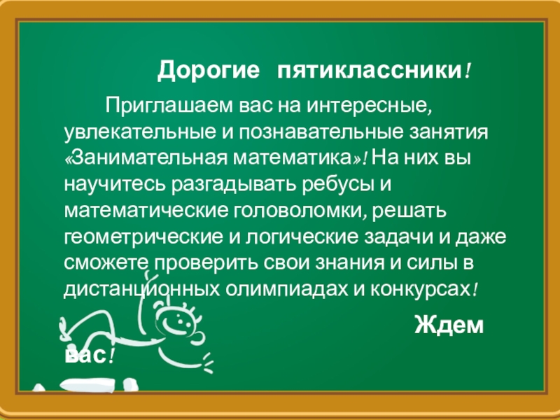 Приглашаем вас на интересные, увлекательные и познавательные занятия «Занимательная математика»! На них вы научитесь разгадывать ребусы и математические головоломки, решать геометрические и логические задачи и даже сможете проверить свои знания и силы в дистанционных олимпиадах и конкурсах!