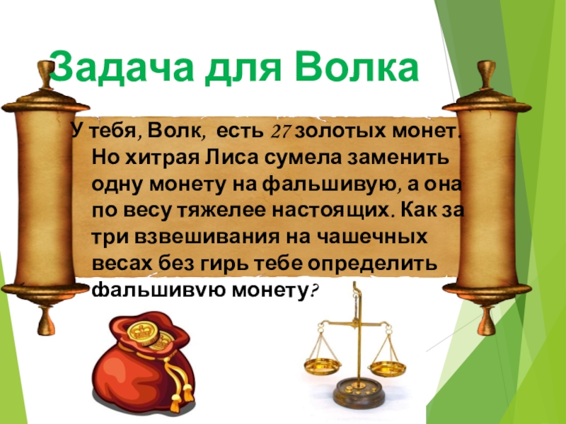 У тебя, Волк, есть 27 золотых монет. Но хитрая