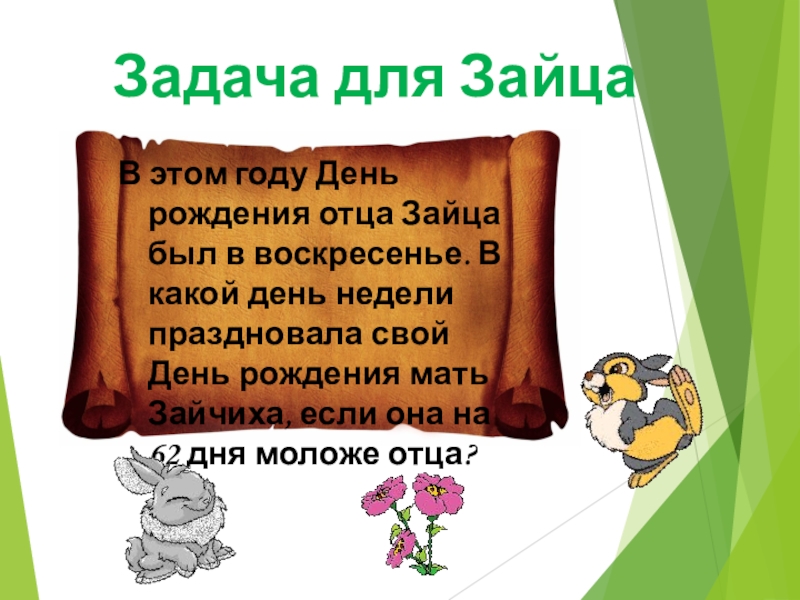 воскресенье. В какой день недели праздновала свой День рождения мать Зайчиха, если она на 62 дня моложе отца?