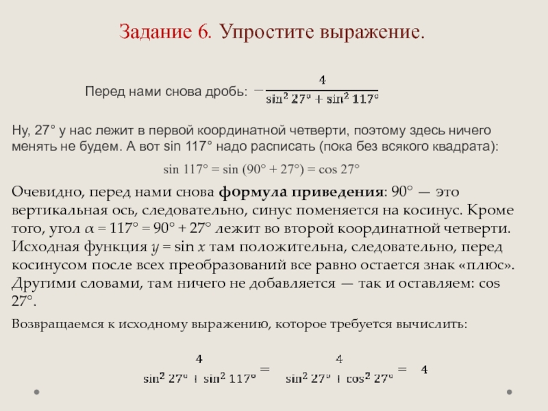 Ну, 27° у нас лежит в первой координатной четверти, поэтому здесь ничего менять не будем. А вот sin 117° надо расписать (пока без всякого квадрата):