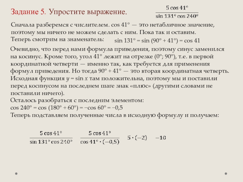 Очевидно, что перед нами формула приведения, поэтому синус заменился на косинус. Кроме того, угол 41° лежит на отрезке (0°; 90°), т.е. в первой координатной четверти — именно так, как требуется для применения формул приведения. Но тогда 90° + 41° — это вторая координатная четверть. Исходная функция y = sin x там положительна, поэтому мы и поставили перед косинусом на последнем шаге знак «плюс» (другими словами не поставили ничего).