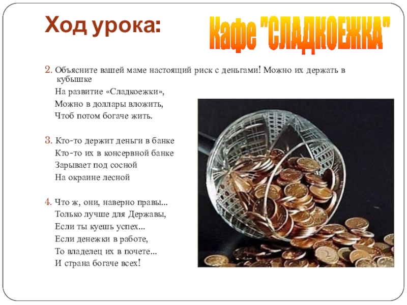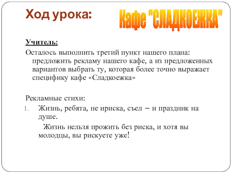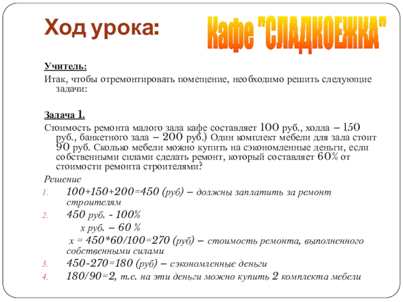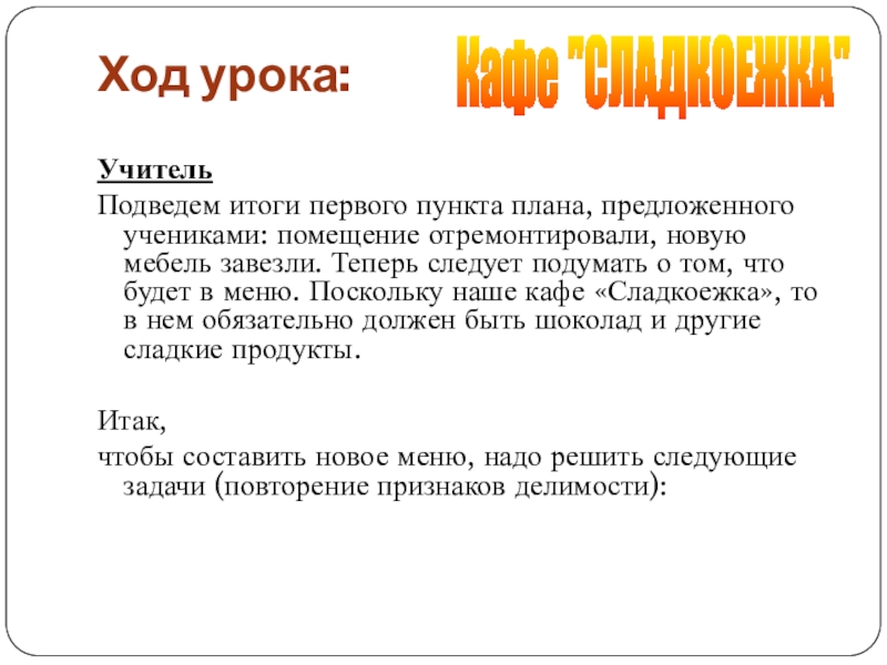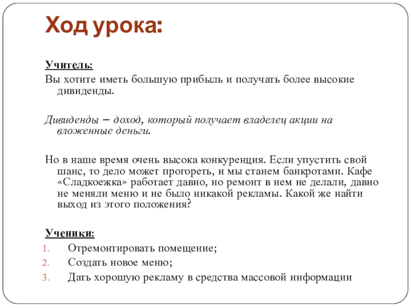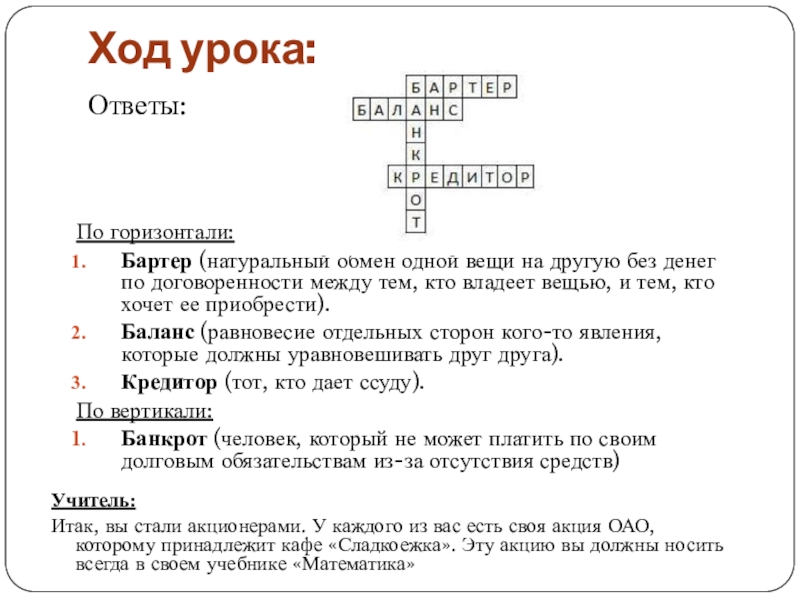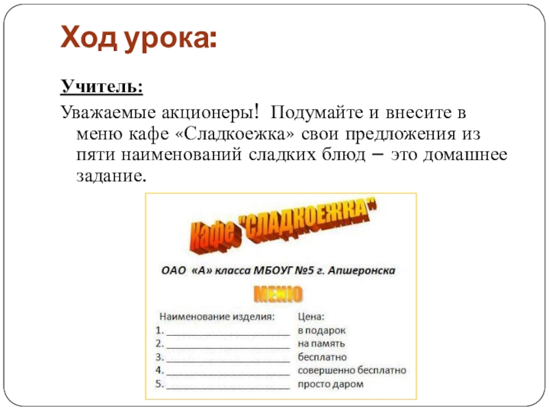 Итак, вы стали акционерами. У каждого из вас есть своя акция ОАО, которому принадлежит кафе «Сладкоежка». Эту акцию вы должны носить всегда в своем учебнике «Математика»