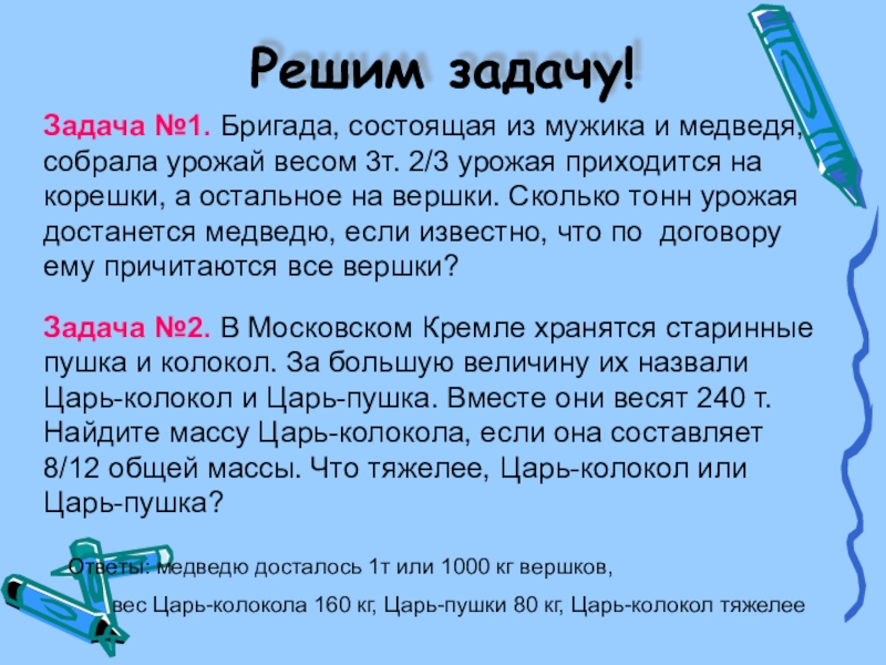 Задача №2. В Московском Кремле хранятся старинные пушка и колокол. За большую величину их назвали Царь-колокол и Царь-пушка. Вместе они весят 240 т. Найдите массу Царь-колокола, если она составляет 8/12 общей массы. Что тяжелее, Царь-колокол или Царь-пушка?