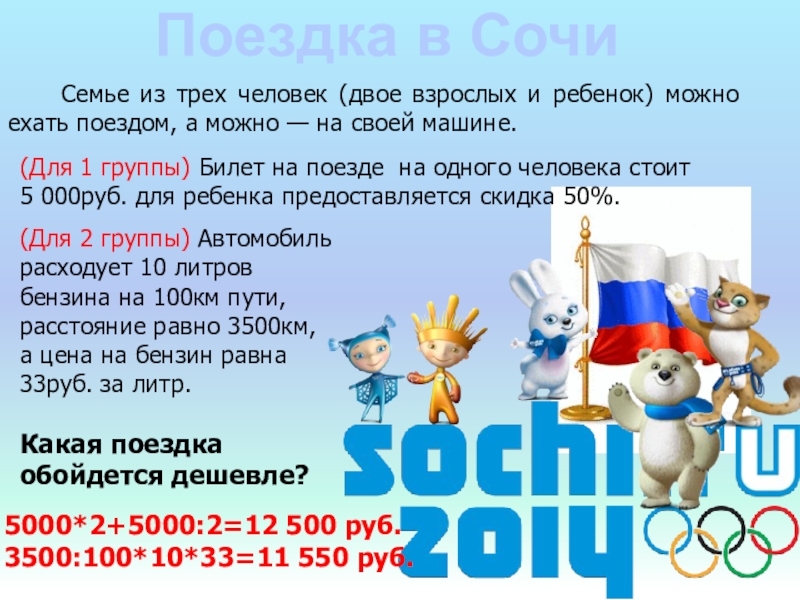 (Для 1 группы) Билет на поезде на одного человека стоит 5 000руб. для ребенка предоставляется скидка 50%.