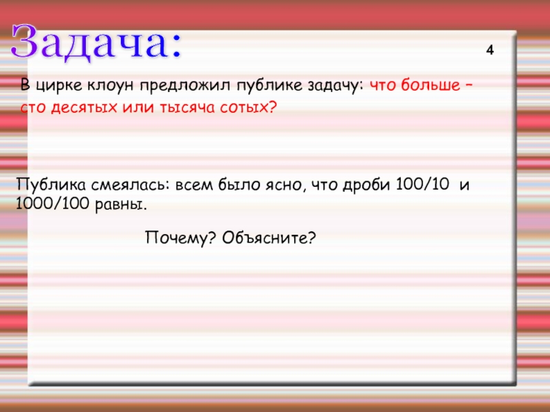 Публика смеялась: всем было ясно, что дроби 100/10 и 1000/100 равны.