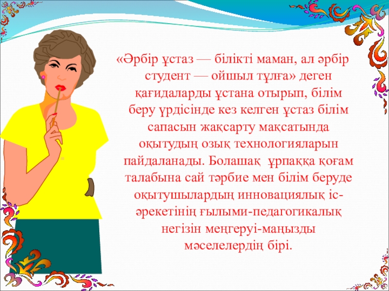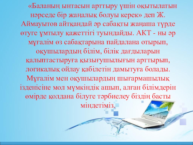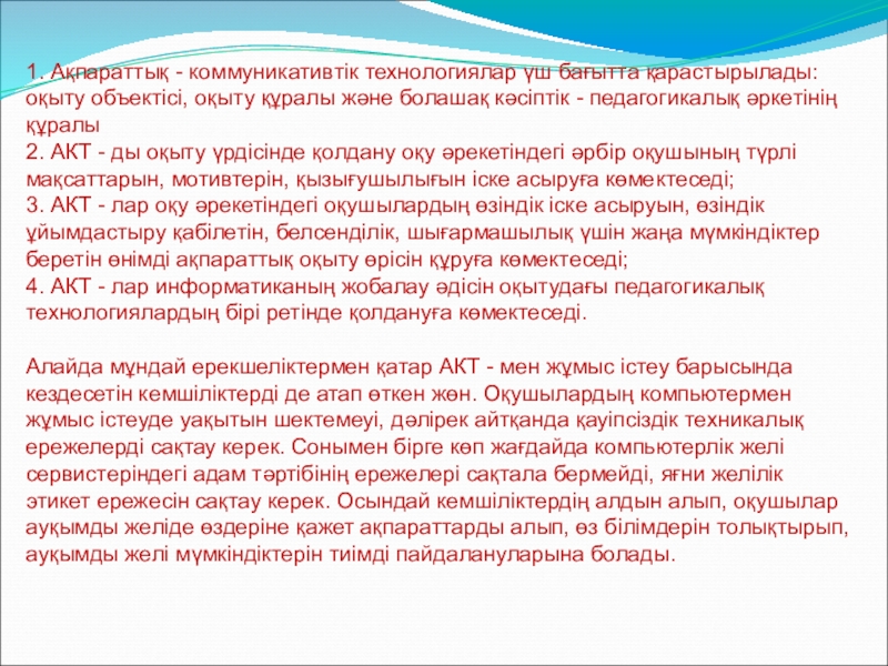 Ақпараттық – коммуникациялық технологияның келешек ұрпақтың жан – жақты білім алуына, іскер әрі талантты, шығармашылығы мол, еркін дамуына жол ашатын педагогикалық, психологиялық жағдай жасау үшін де тигізер пайдасы аса мол.