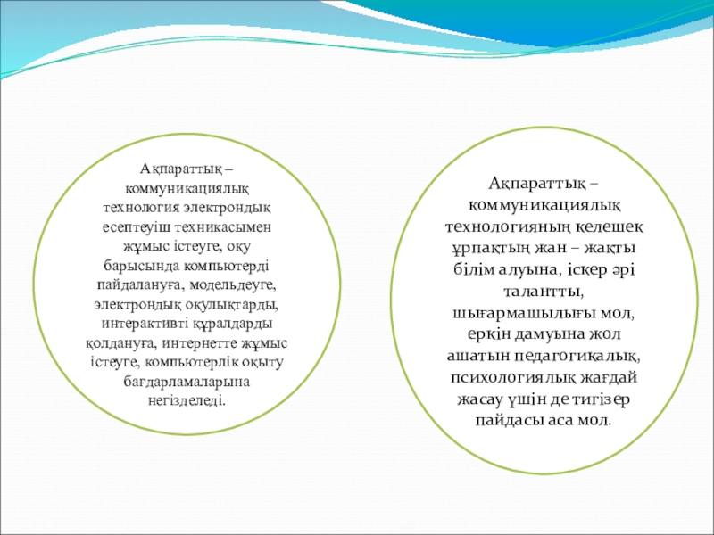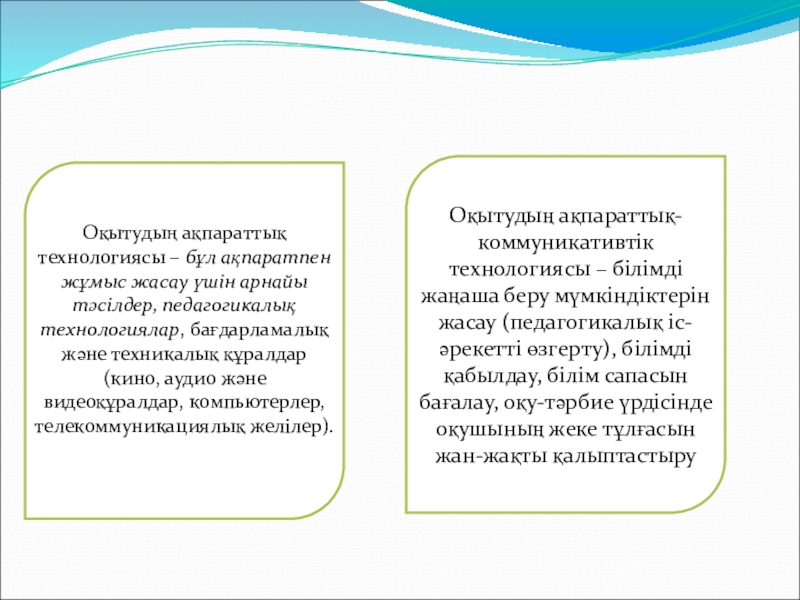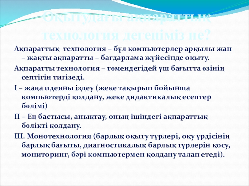 Оқытудың ақпараттық-коммуникативтік технологиясы – білімді жаңаша беру мүмкіндіктерін жасау (педагогикалық іс-әрекетті өзгерту), білімді қабылдау, білім сапасын бағалау, оқу-тәрбие үрдісінде оқушының жеке тұлғасын жан-жақты қалыптастыру