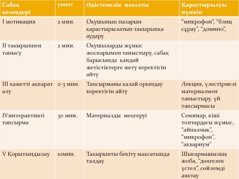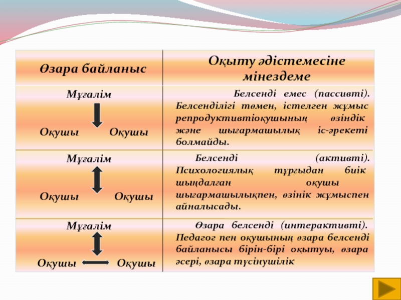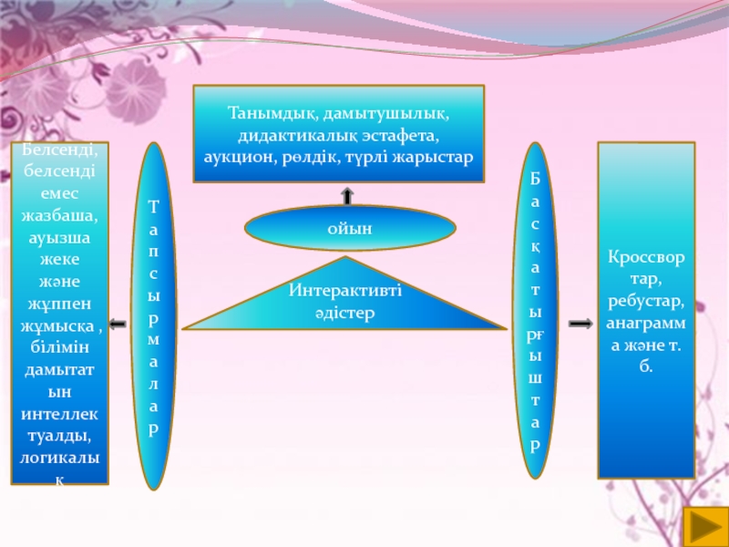 Белсенді, белсенді емес жазбаша, ауызша жеке және жұппен жұмысқа , білімін дамытатын интеллектуалды, логикалы қ