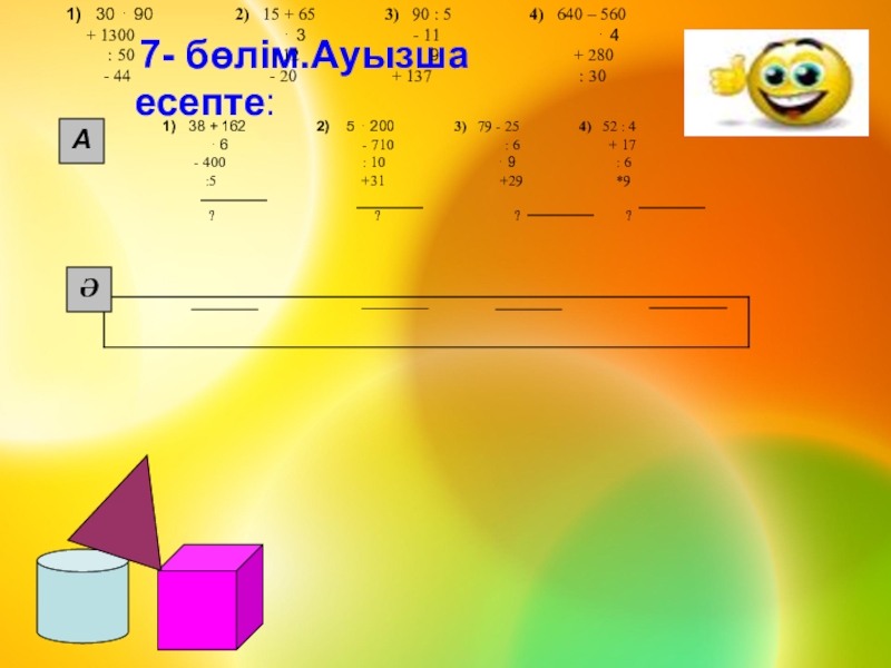 1) 30 ⋅ 90 2) 15 + 65 3) 90 : 5 4) 640 – 560