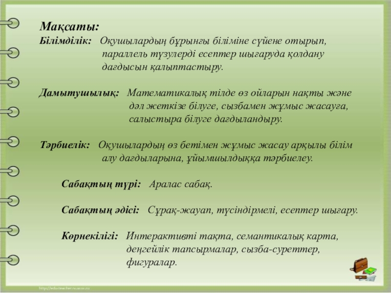 Берілген түзуде жатпайтын бір нүкте арқылы сол түзуге бір ғана параллель түзу жүргізуге болады.