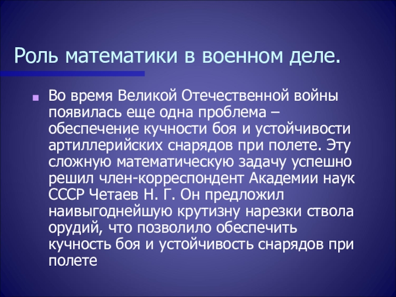 одна проблема – обеспечение кучности боя и устойчивости артиллерийских снарядов при полете. Эту сложную математическую задачу успешно решил член-корреспондент Академии наук СССР Четаев Н. Г. Он предложил наивыгоднейшую крутизну нарезки ствола орудий, что позволило обеспечить кучность боя и устойчивость снарядов при полете