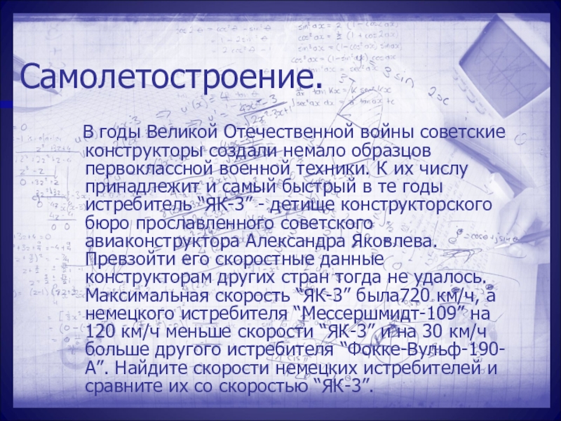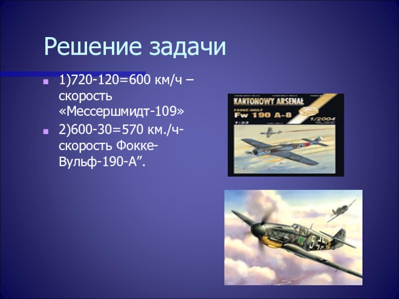немало образцов первоклассной военной техники. К их числу принадлежит и самый быстрый в те годы истребитель “ЯК-3” - детище конструкторского бюро прославленного советского авиаконструктора Александра Яковлева. Превзойти его скоростные данные конструкторам других стран тогда не удалось. Максимальная скорость “ЯК-3” была720 км/ч, а немецкого истребителя “Мессершмидт-109” на 120 км/ч меньше скорости “ЯК-3” и на 30 км/ч больше другого истребителя “Фокке-Вульф-190-А”. Найдите скорости немецких истребителей и сравните их со скоростью “ЯК-3”.