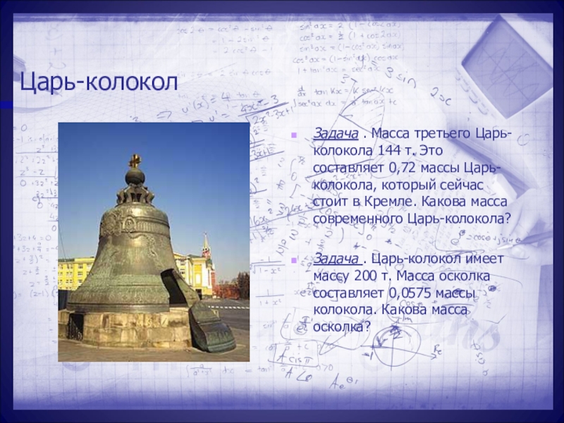 Задача . Масса третьего Царь-колокола 144 т. Это составляет 0,72 массы