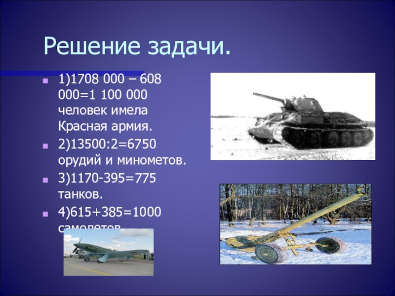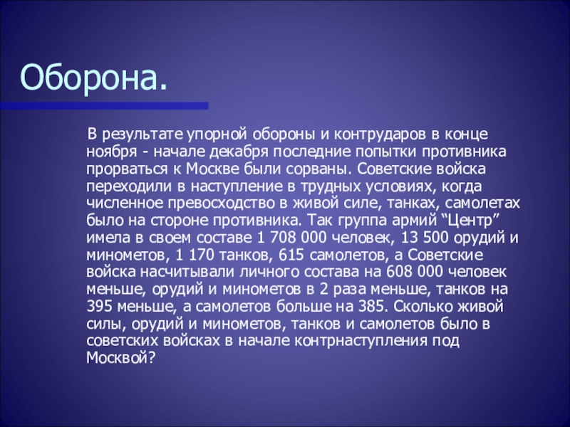 конце ноября - начале декабря последние попытки противника прорваться к Москве были сорваны. Советские войска переходили в наступление в трудных условиях, когда численное превосходство в живой силе, танках, самолетах было на стороне противника. Так группа армий “Центр” имела в своем составе 1 708 000 человек, 13 500 орудий и минометов, 1 170 танков, 615 самолетов, а Советские войска насчитывали личного состава на 608 000 человек меньше, орудий и минометов в 2 раза меньше, танков на 395 меньше, а самолетов больше на 385. Сколько живой силы, орудий и минометов, танков и самолетов было в советских войсках в начале контрнаступления под Москвой?