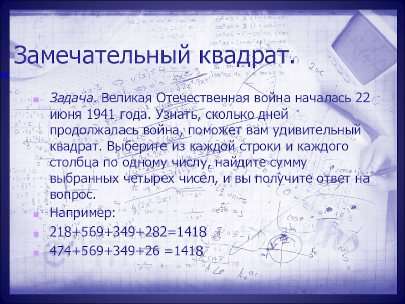 сколько дней продолжалась война, поможет вам удивительный квадрат. Выберите из каждой строки и каждого столбца по одному числу, найдите сумму выбранных четырех чисел, и вы получите ответ на вопрос.