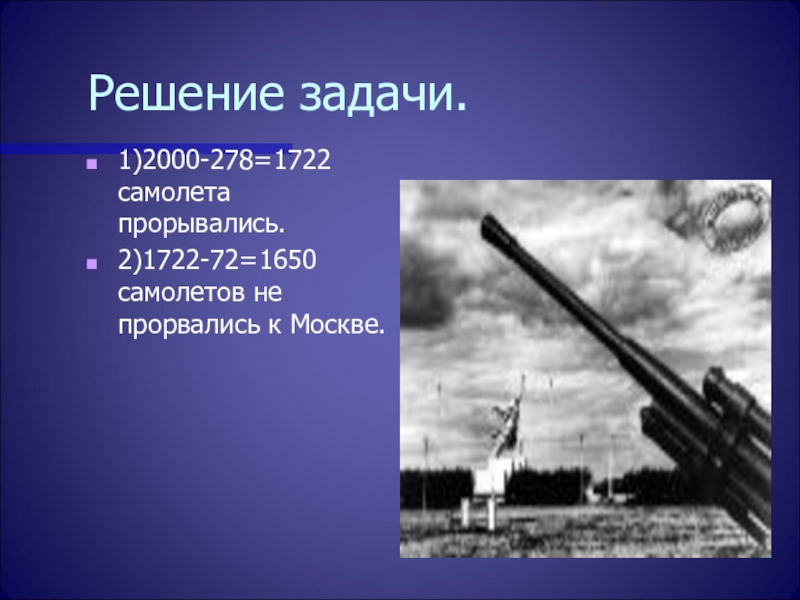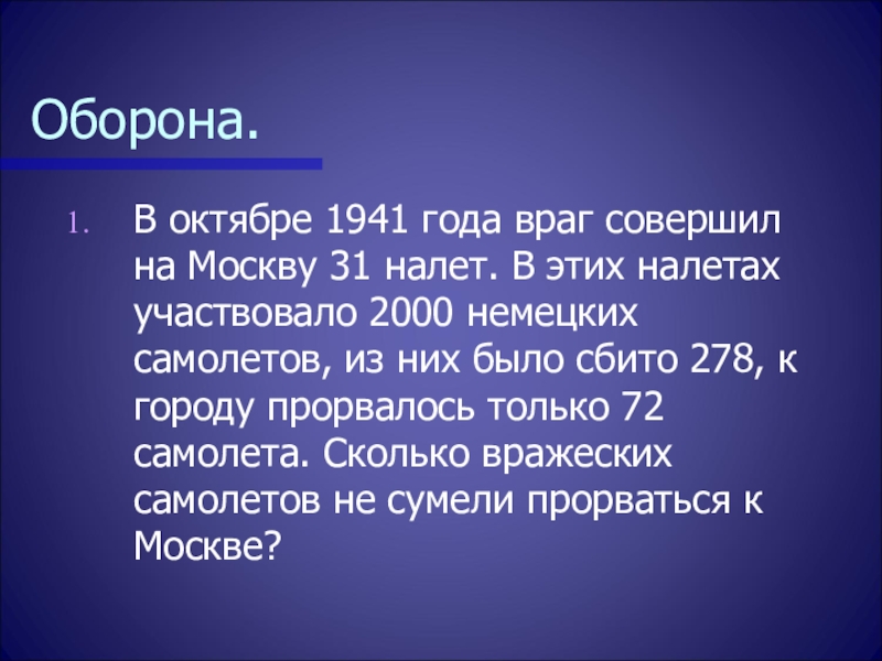 этих налетах участвовало 2000 немецких самолетов, из них было сбито 278, к городу прорвалось только 72 самолета. Сколько вражеских самолетов не сумели прорваться к Москве?