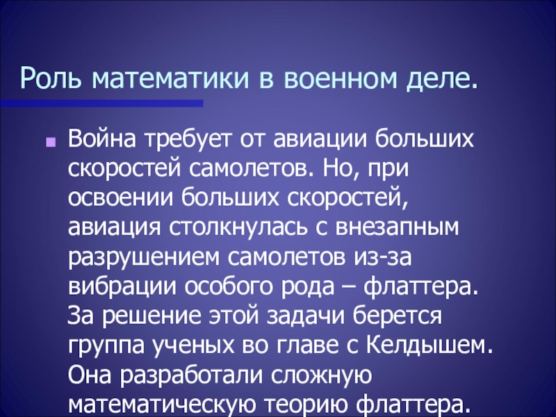 Но, при освоении больших скоростей, авиация столкнулась с внезапным разрушением самолетов из-за вибрации особого рода – флаттера. За решение этой задачи берется группа ученых во главе с Келдышем. Она разработали сложную математическую теорию флаттера.