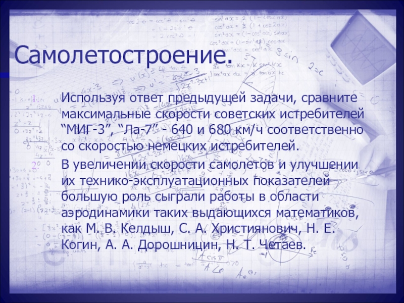 В увеличении скорости самолетов и улучшении их технико-эксплуатационных показателей большую роль сыграли работы в области аэродинамики таких выдающихся математиков, как М. В. Келдыш, С. А. Християнович, Н. Е. Когин, А. А. Дорошницин, Н. Т. Четаев.