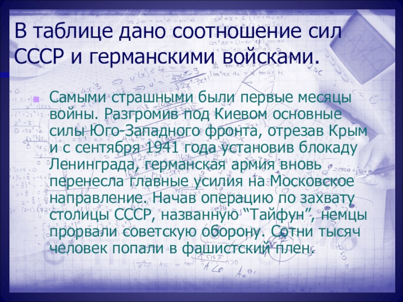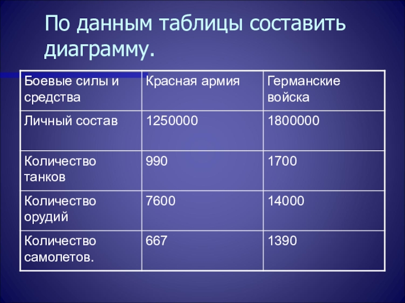 Слайд 18В таблице дано соотношение сил СССР и германскими войсками.
