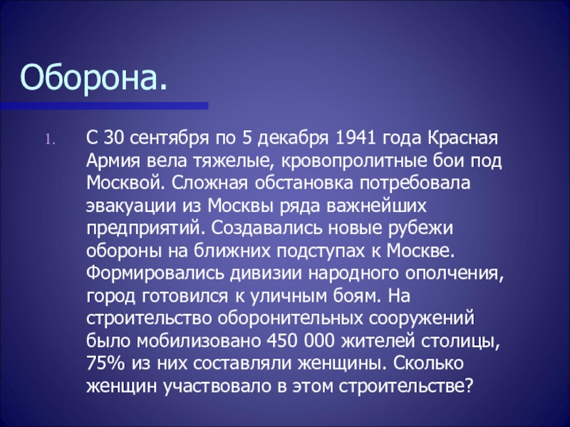 тяжелые, кровопролитные бои под Москвой. Сложная обстановка потребовала эвакуации из Москвы ряда важнейших предприятий. Создавались новые рубежи обороны на ближних подступах к Москве. Формировались дивизии народного ополчения, город готовился к уличным боям. На строительство оборонительных сооружений было мобилизовано 450 000 жителей столицы, 75% из них составляли женщины. Сколько женщин участвовало в этом строительстве?