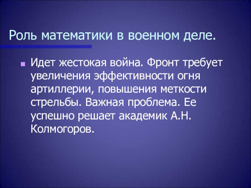 огня артиллерии, повышения меткости стрельбы. Важная проблема. Ее успешно решает академик А.Н.Колмогоров.