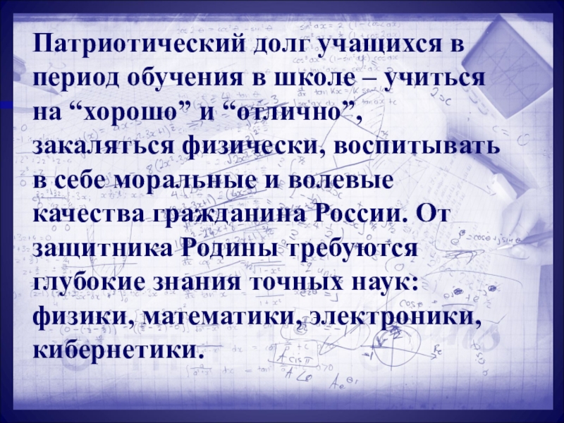 “хорошо” и “отлично”, закаляться физически, воспитывать в себе моральные и волевые качества гражданина России. От защитника Родины требуются глубокие знания точных наук: физики, математики, электроники, кибернетики.