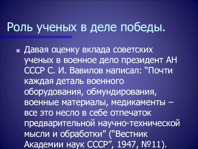 дело президент АН СССР С. И. Вавилов написал: “Почти каждая деталь военного оборудования, обмундирования, военные материалы, медикаменты – все это несло в себе отпечаток предварительной научно-технической мысли и обработки” (“Вестник Академии наук СССР”, 1947, №11).