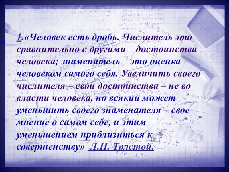 достоинства человека; знаменатель – это оценка человеком самого себя. Увеличить своего числителя – свои достоинства – не во власти человека, но всякий может уменьшить своего знаменателя – свое мнение о самом себе, и этим уменьшением приблизиться к совершенству» Л.Н. Толстой.