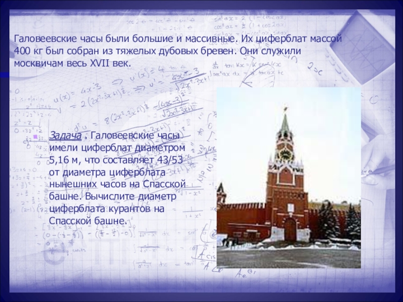 Задача . Галовеевские часы имели циферблат диаметром 5,16 м, что составляет 43/53 от диаметра циферблата нынешних часов на Спасской башне. Вычислите диаметр циферблата курантов на Спасской башне.