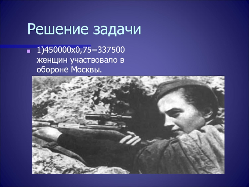 1)450000х0,75=337500 женщин участвовало в обороне Москвы.