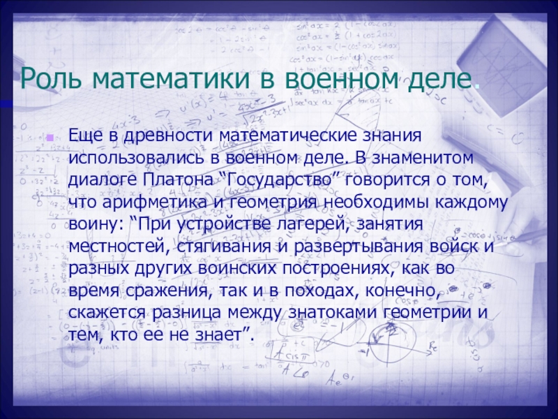 Слайд 32Роль математики в военном деле.